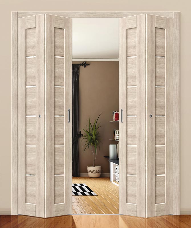 Складные двери функционирую по принципу жалюзи, они включают в себя несколько ламелей, скрепленные друг с другом.